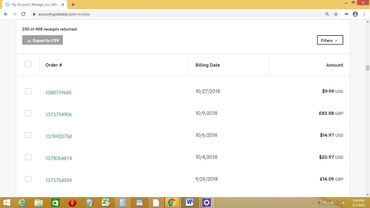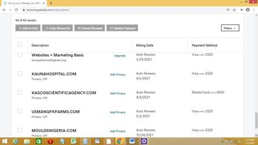 5. Other photos show sections of 458 previous payments to godaddy company in previous years in US$ British Pounds and Canadian dollars